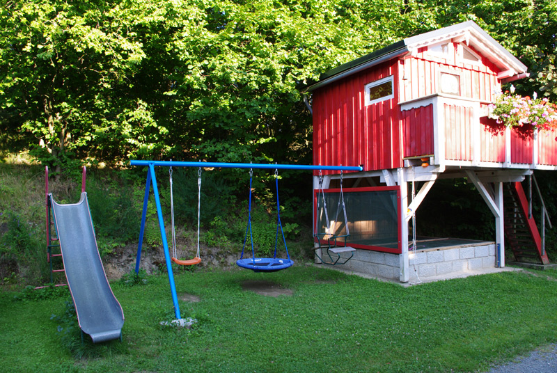 Neben dem im Garten befindlichen Ferienhaus gibt es einen Kinderspielplatz mit Sandkasten, Rutsche, Schaukel, Trampolin und ein Spielhaus. Ebenfalls stehen eine Tischtennisplatte und ein Fußballtor zum herumtoben für die jüngeren Gäste bereit.