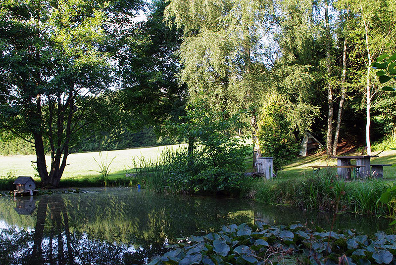 Bei Grillabenden mit Lagerfeuerromatik können Sie an unserem kleinen Teich am Waldrand den Tag entspannt ausklingen lassen.